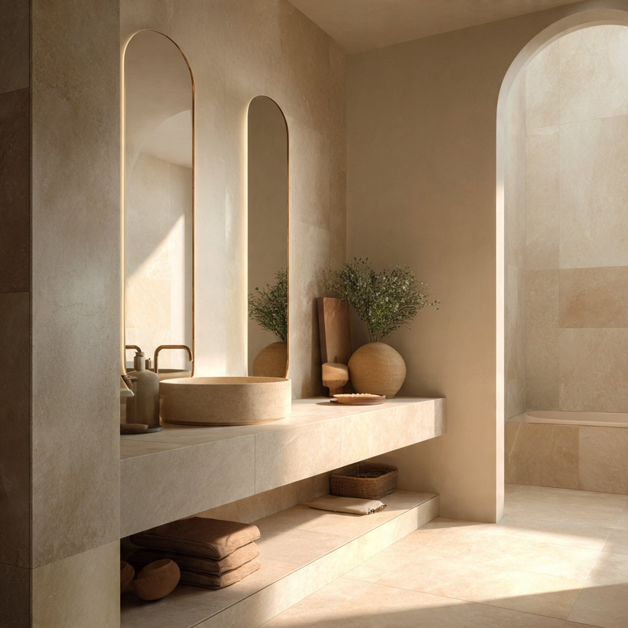 Organic details help soften the look. Think handmade ceramics, gently curved mirrors, or slightly textured tiles that catch the light in a natural way.