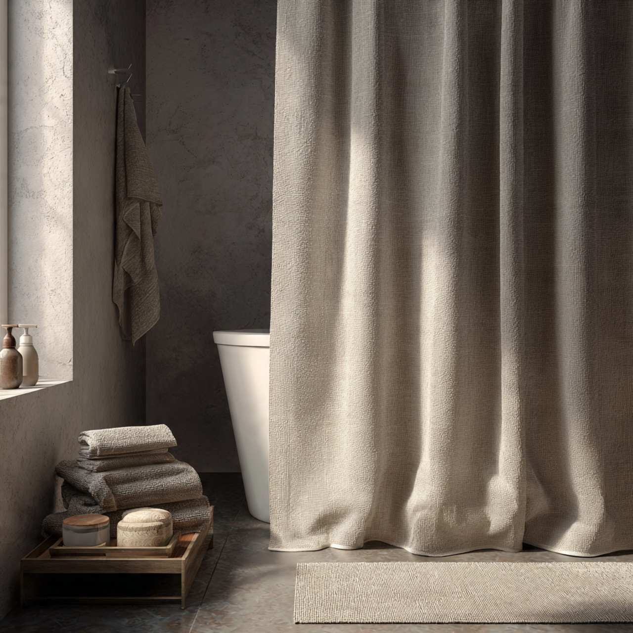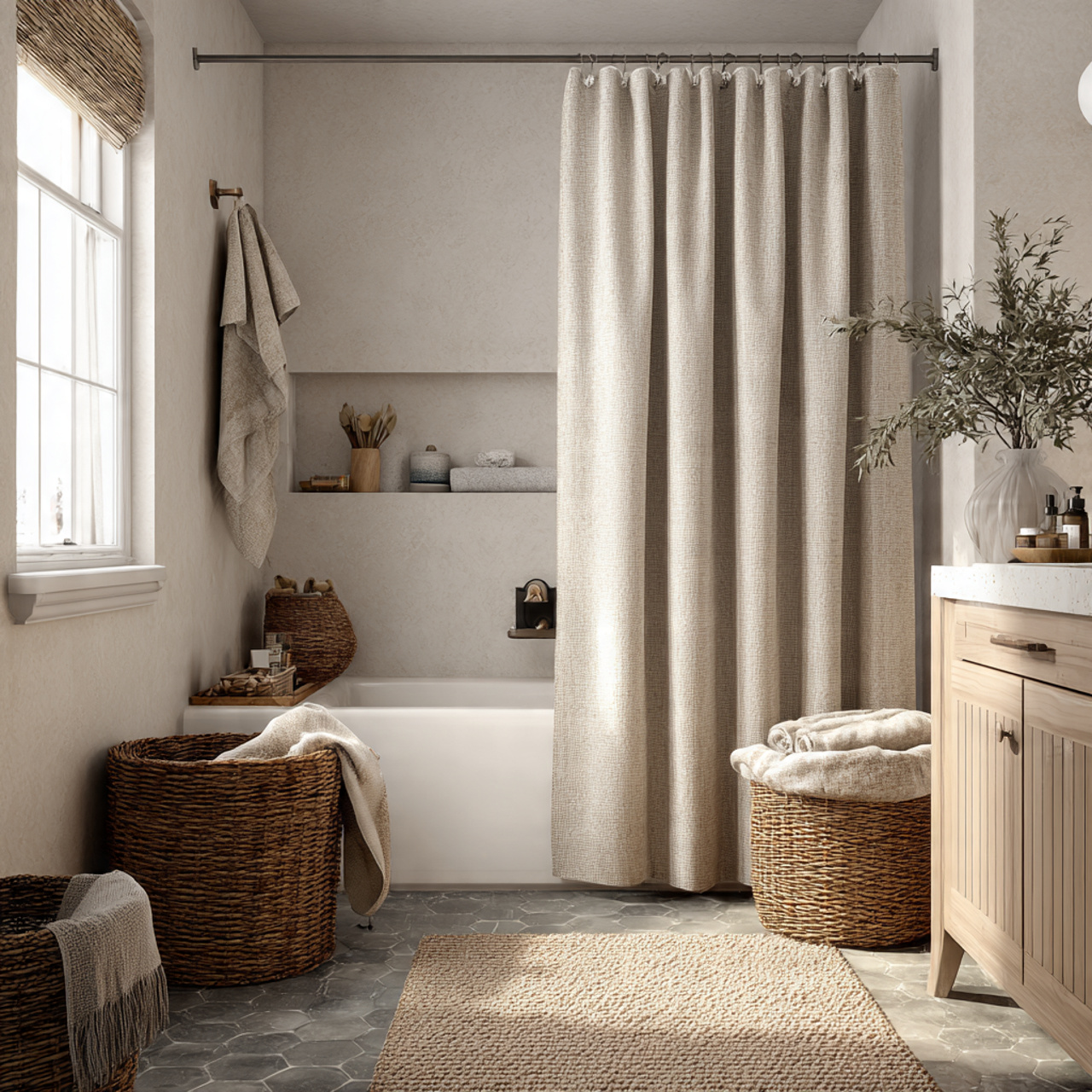 6. Neutral Bathroom with Linen Textiles and Simple Styling