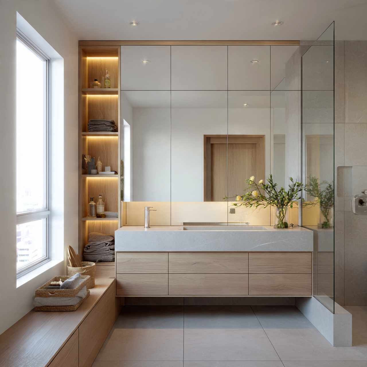 Drawers, mirrored cabinets, and recessed shelves keep essentials out of sight while staying accessible.