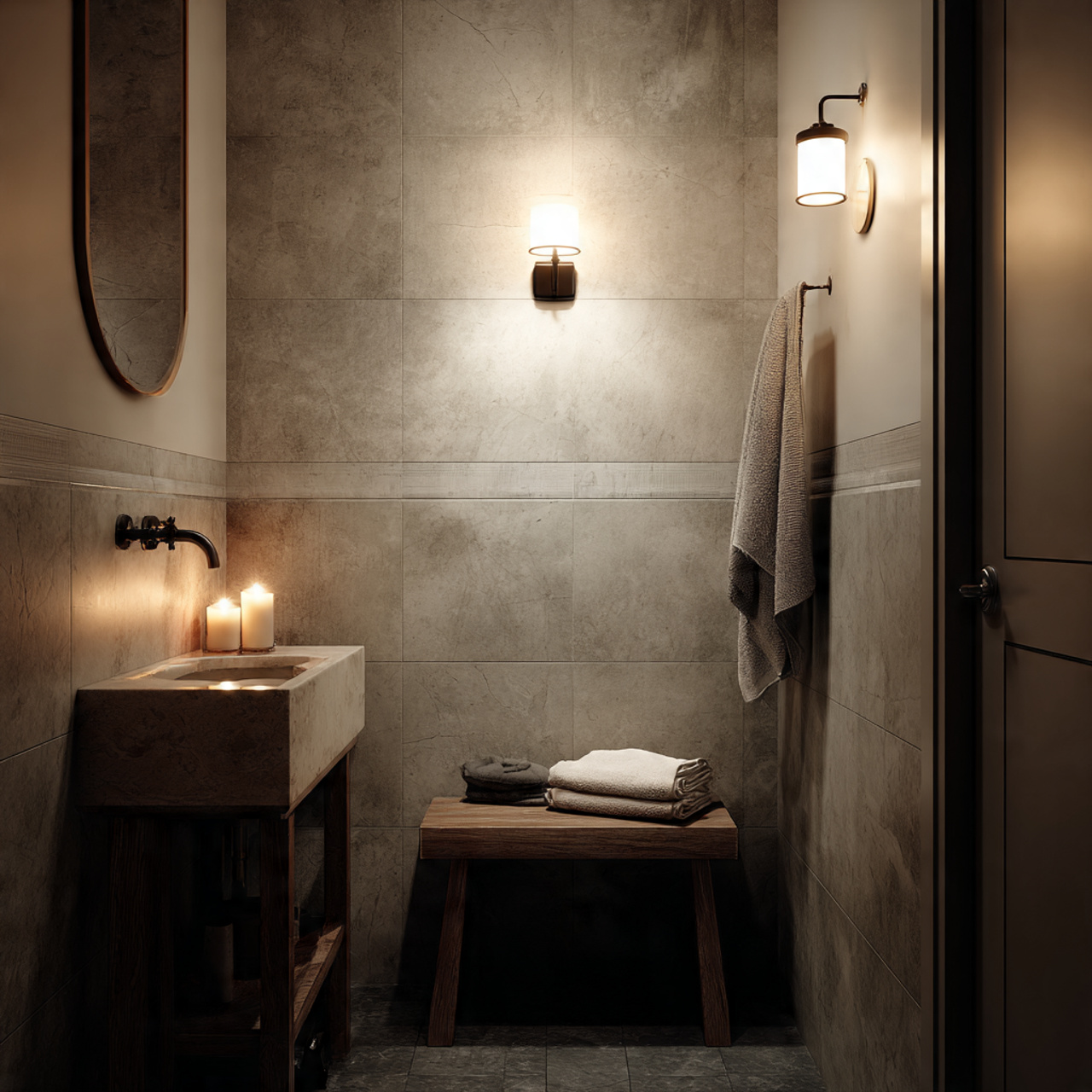 Soft, layered lighting creates a spa-like atmosphere. Wall sconces, diffused ceiling lights, or a small lamp near the vanity can change the entire mood.
