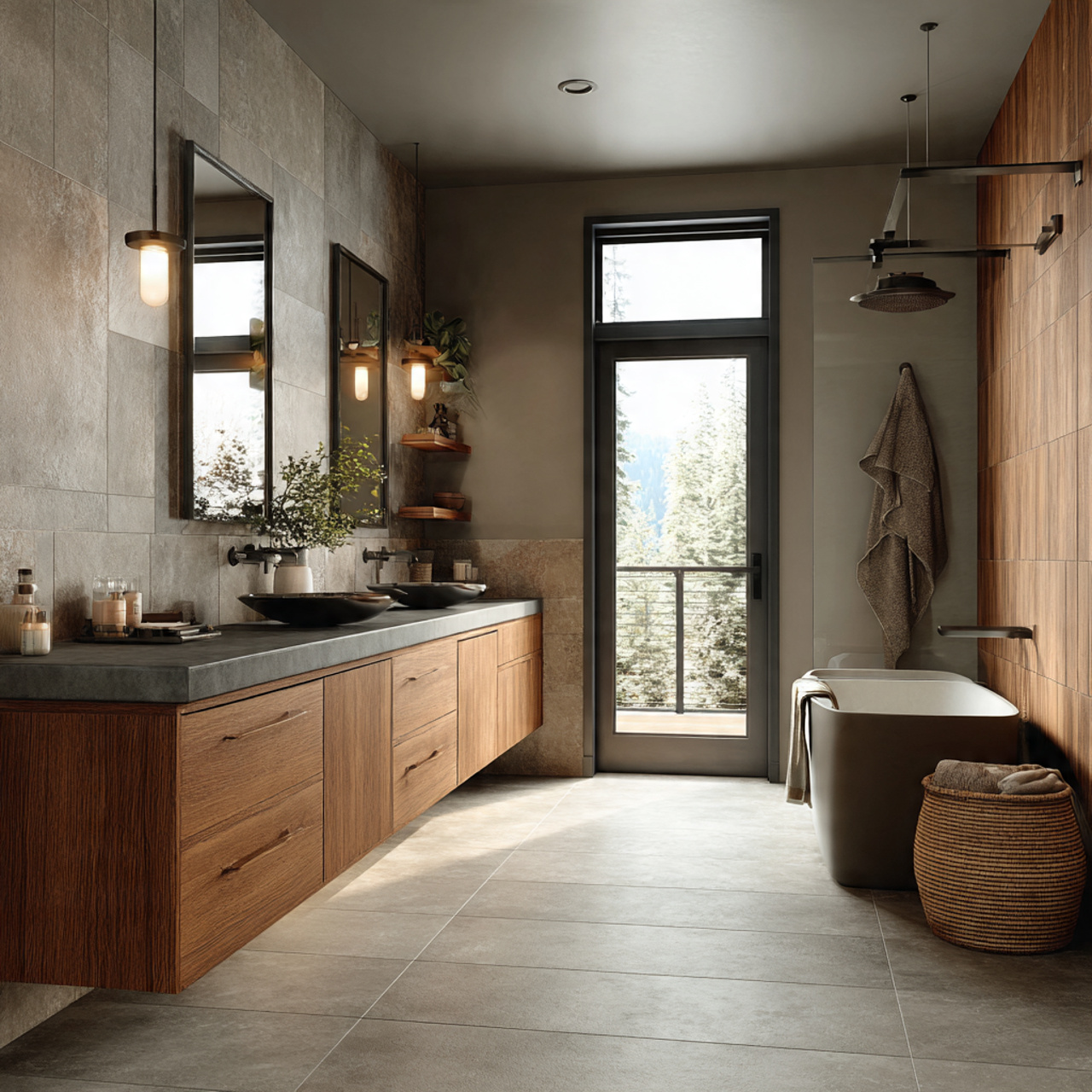 I have found that texture matters just as much as color here. Smooth tiles paired with woven baskets, soft towels, and natural stone keep the space from feeling flat or cold.