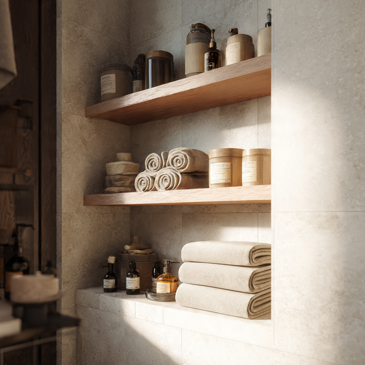 Open shelving can work beautifully in a minimalist bathroom when done with restraint. The goal is breathing room, not display.