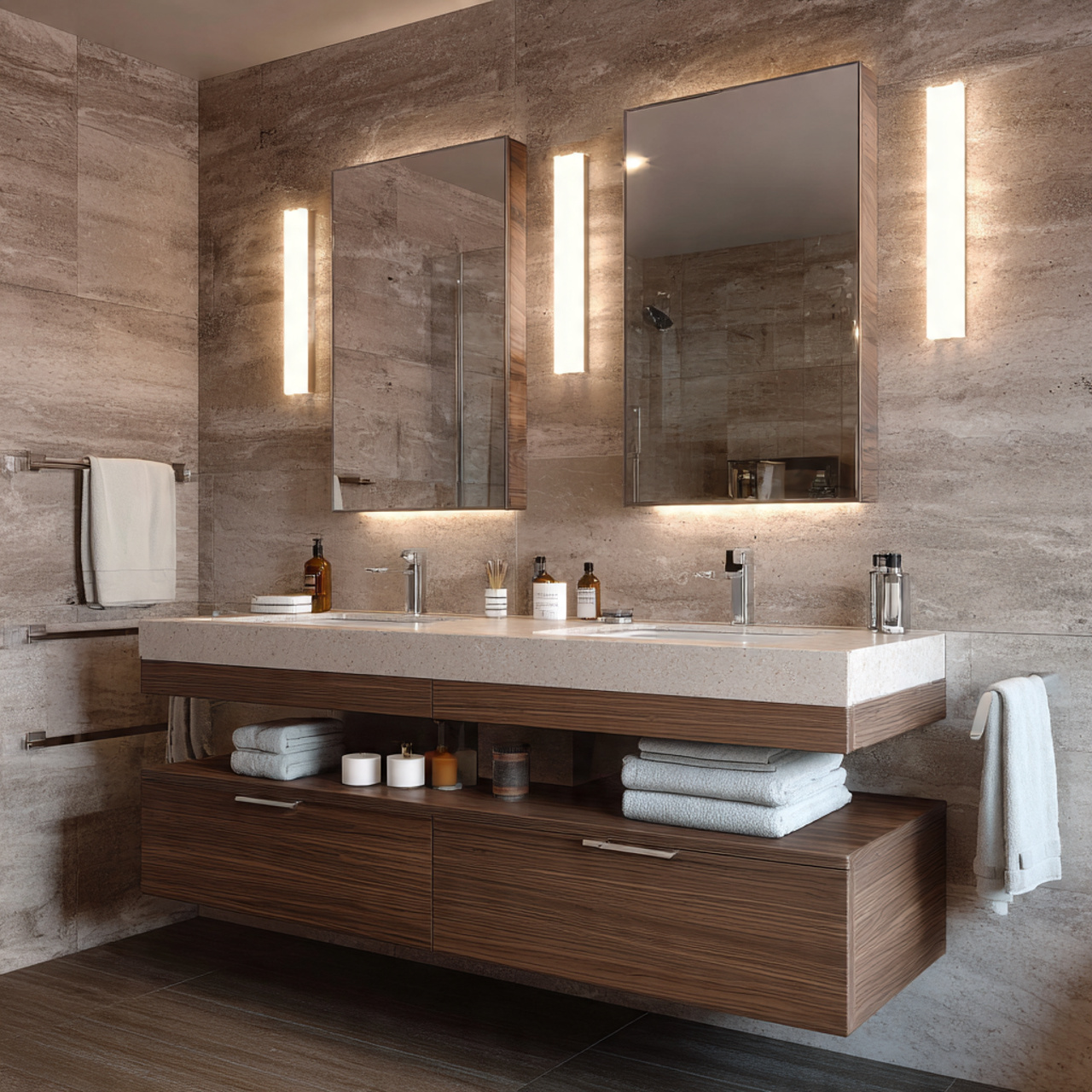 Stone accents add a spa-like quality that feels timeless. Marble, travertine, or even concrete finishes create subtle interest without overwhelming the senses.