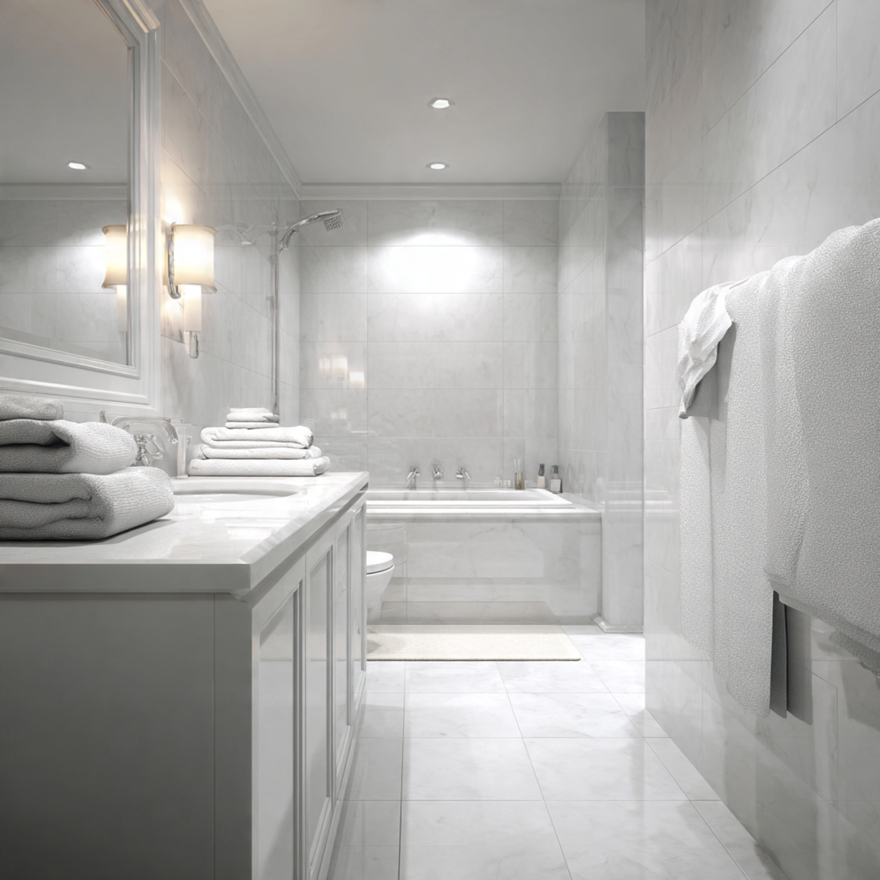 An all white bathroom does not have to feel flat. When done well, it actually feels expansive and refined. The secret is layering finishes instead of relying on one flat white surface.