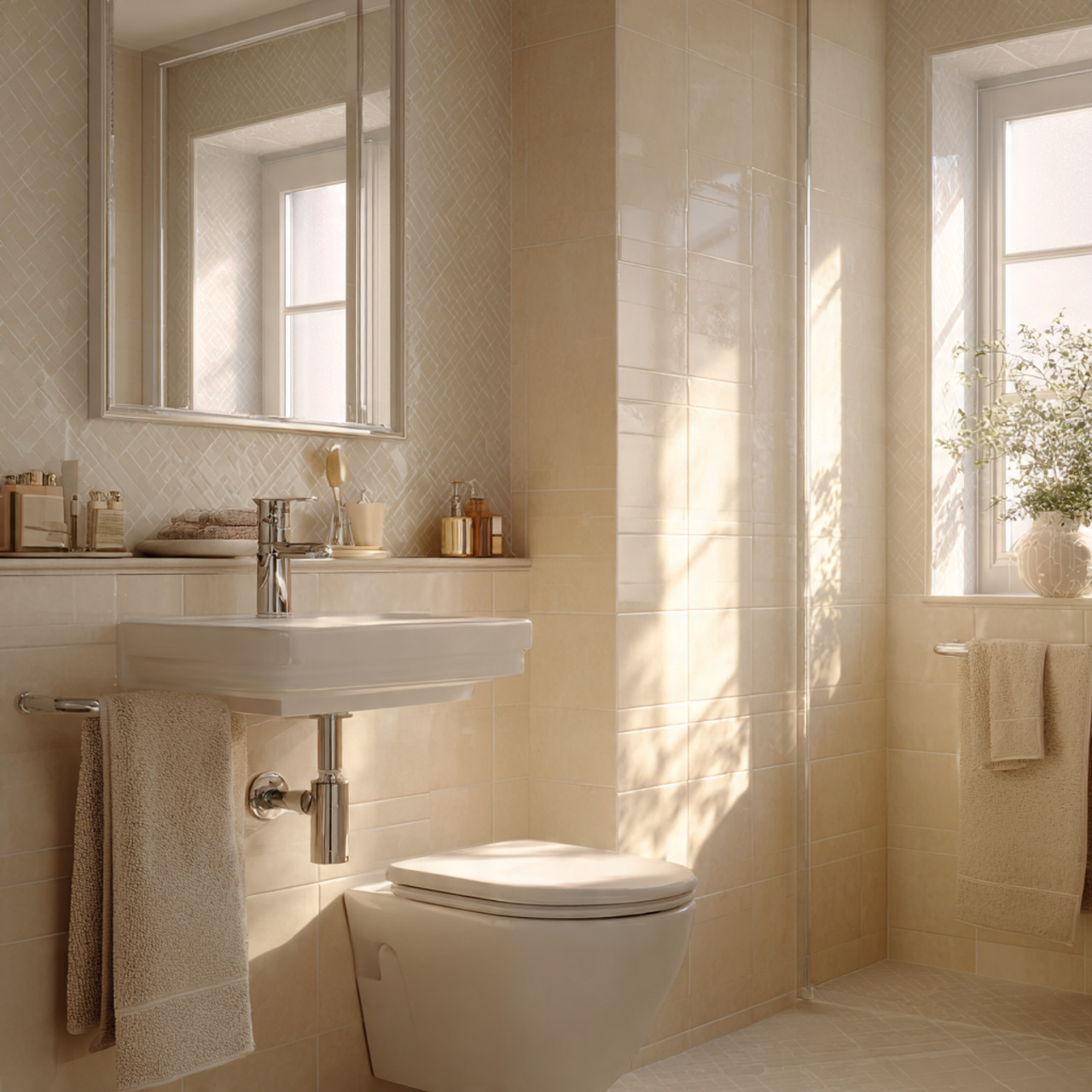 The palette works best when colors stay close in value. Cream walls paired with sand-toned tiles keep the look cohesive and easy on the eyes. Nothing competes for attention.