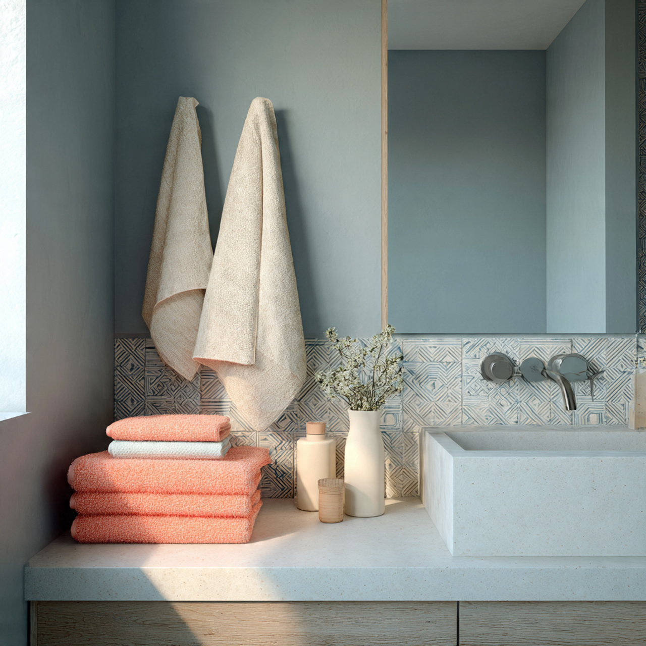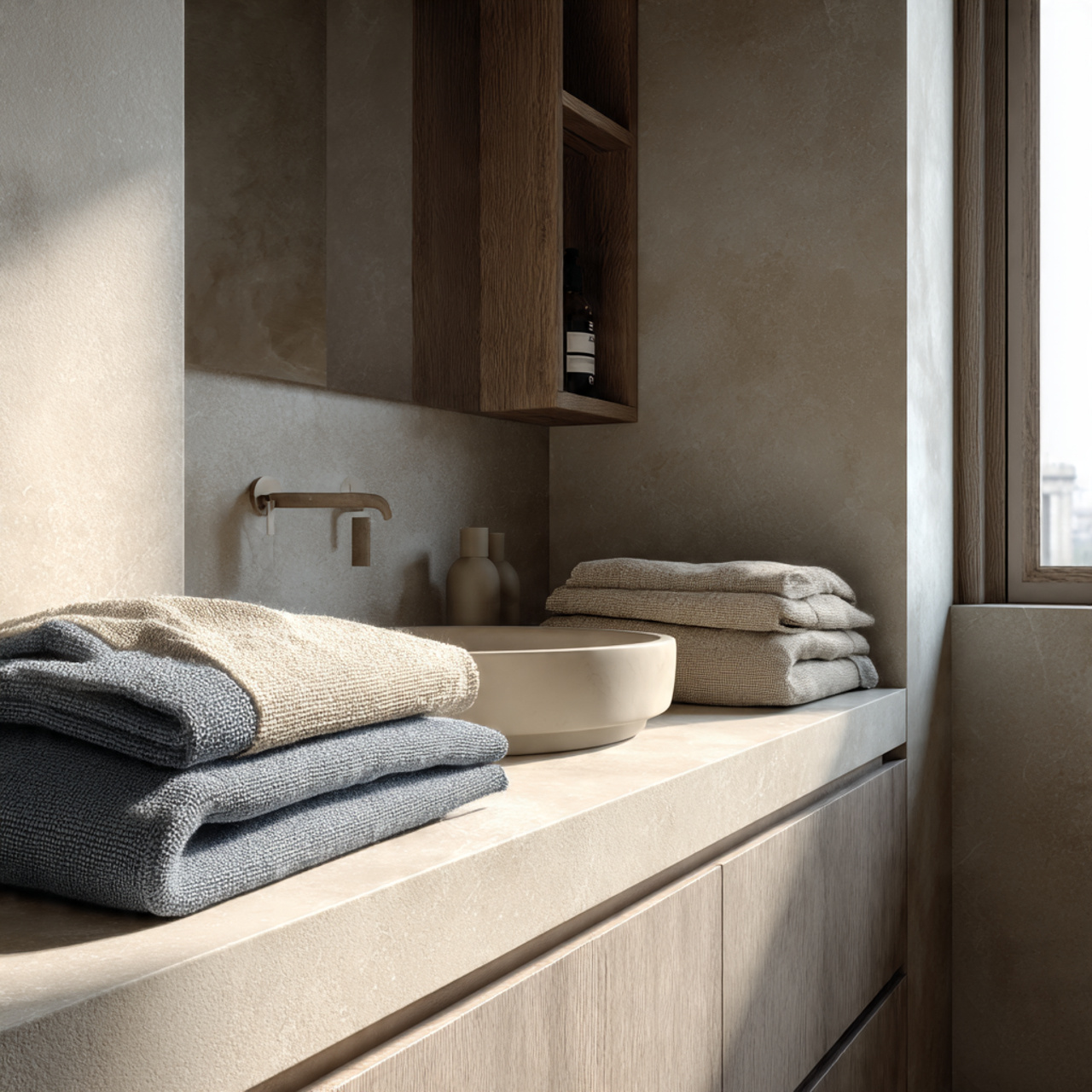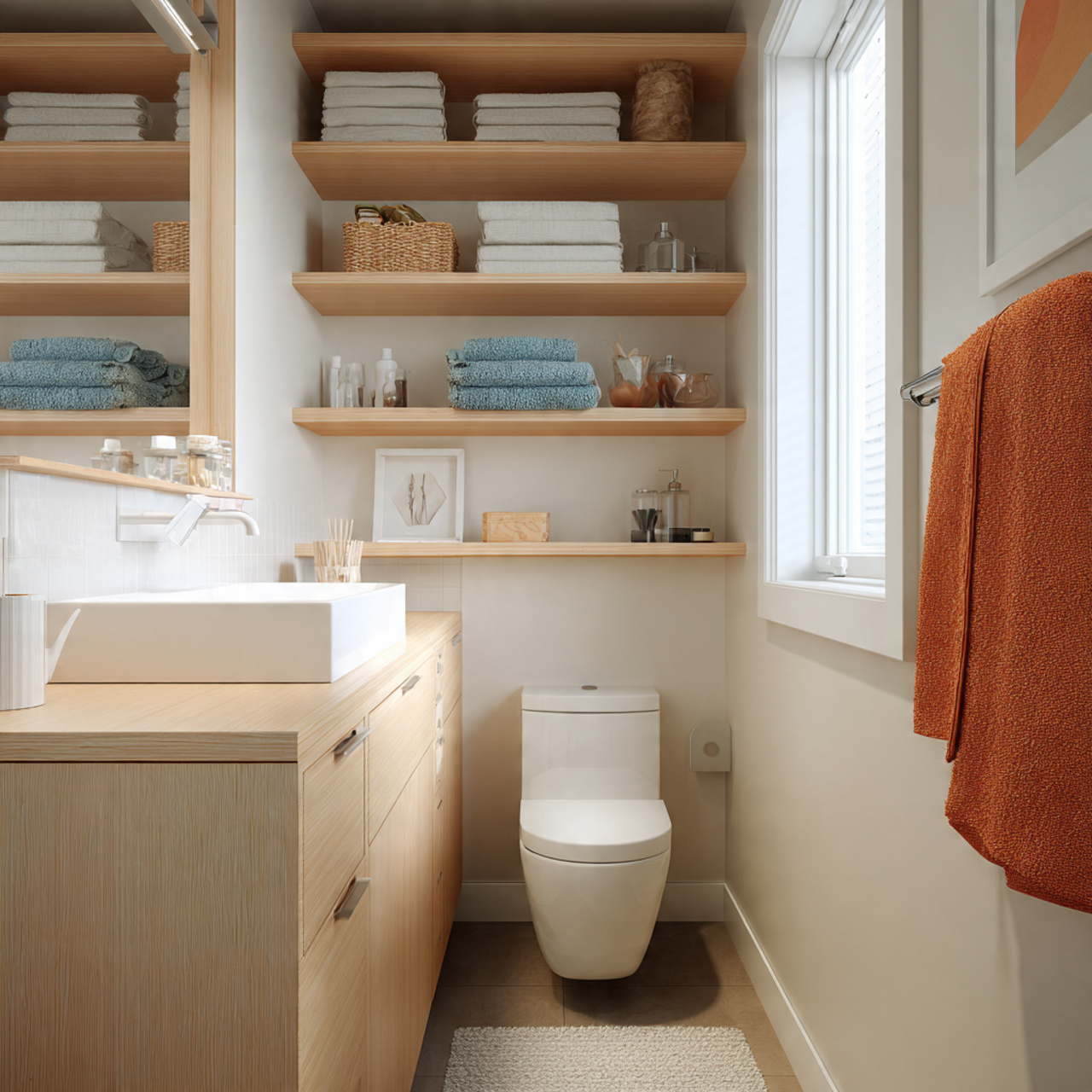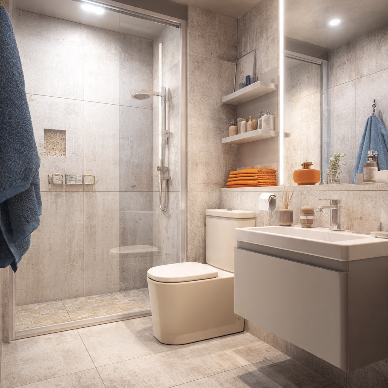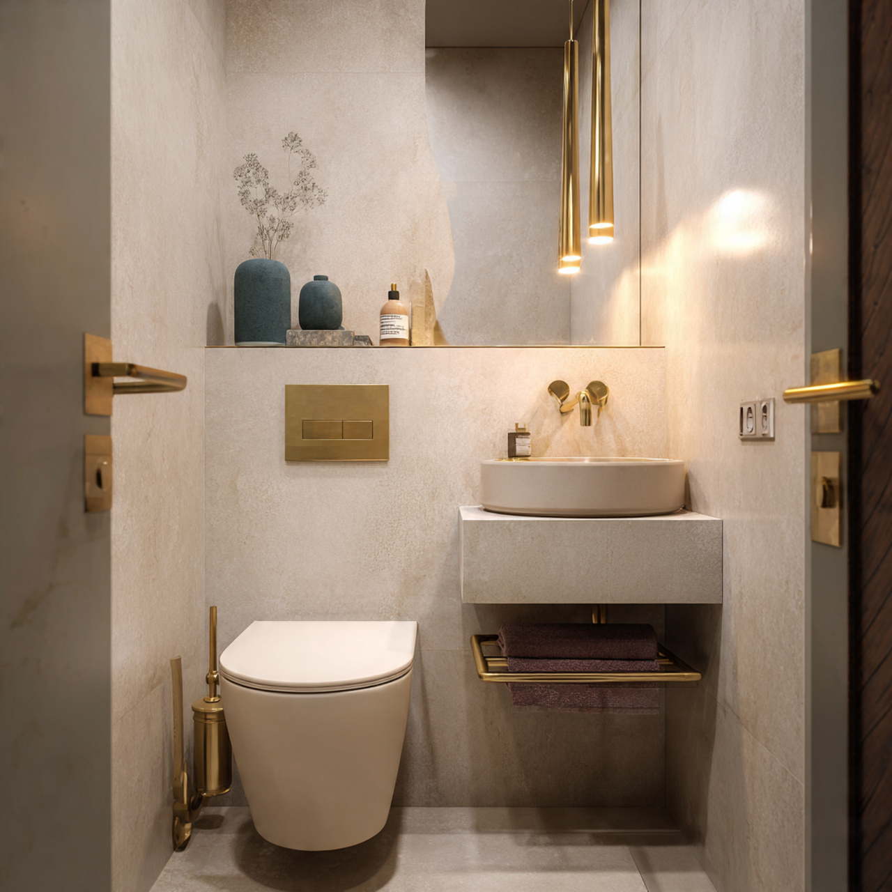 Blush neutrals offer warmth without heaviness. In small bathrooms, they reflect light softly and create a welcoming glow that makes the room feel more spacious.