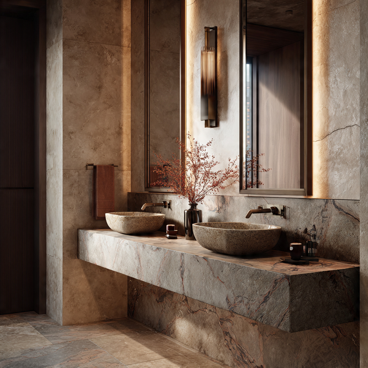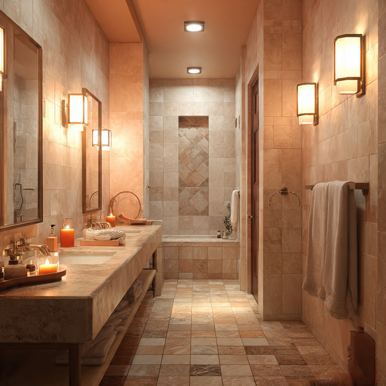 This approach works well in bathrooms with limited natural light. The warm tones help prevent shadows from feeling harsh or heavy.
