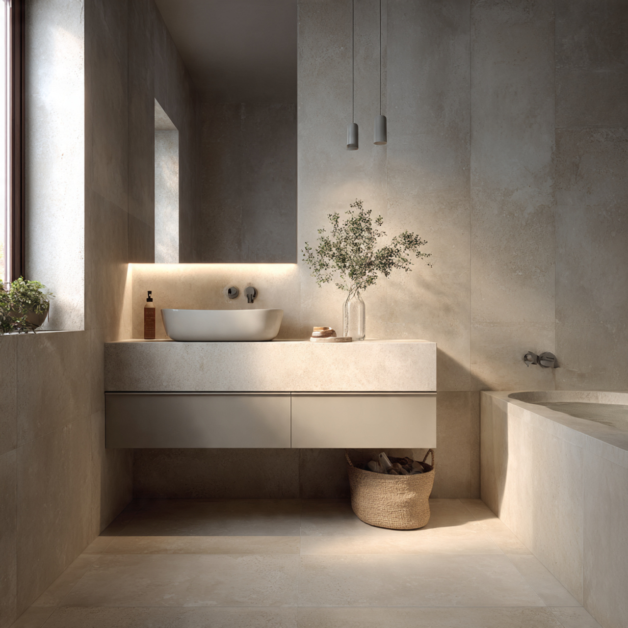 Texture plays an important role here. Matte finishes, gentle stone patterns, or lightly textured tiles add depth without closing in the space. Everything feels layered but still light.