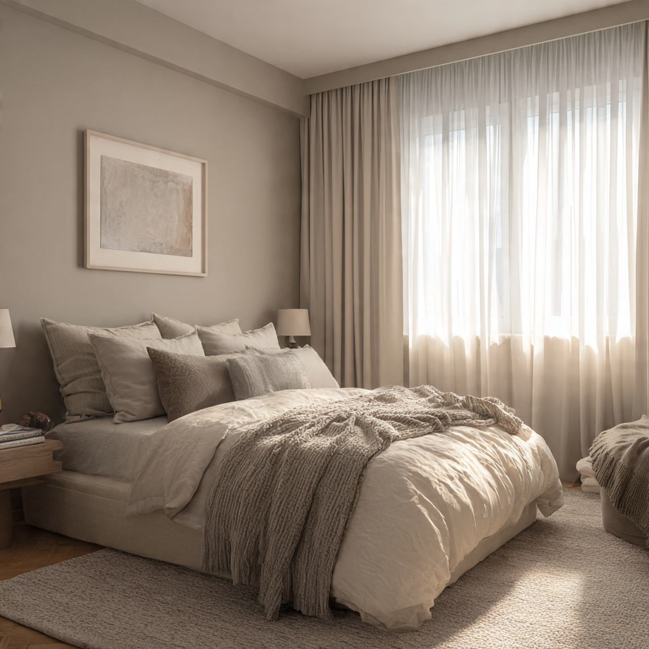 Soft, muted colors instantly tell your brain that it is time to relax. Shades like warm beige, light taupe, soft grey, and creamy white help reduce visual stress, especially after a long day.