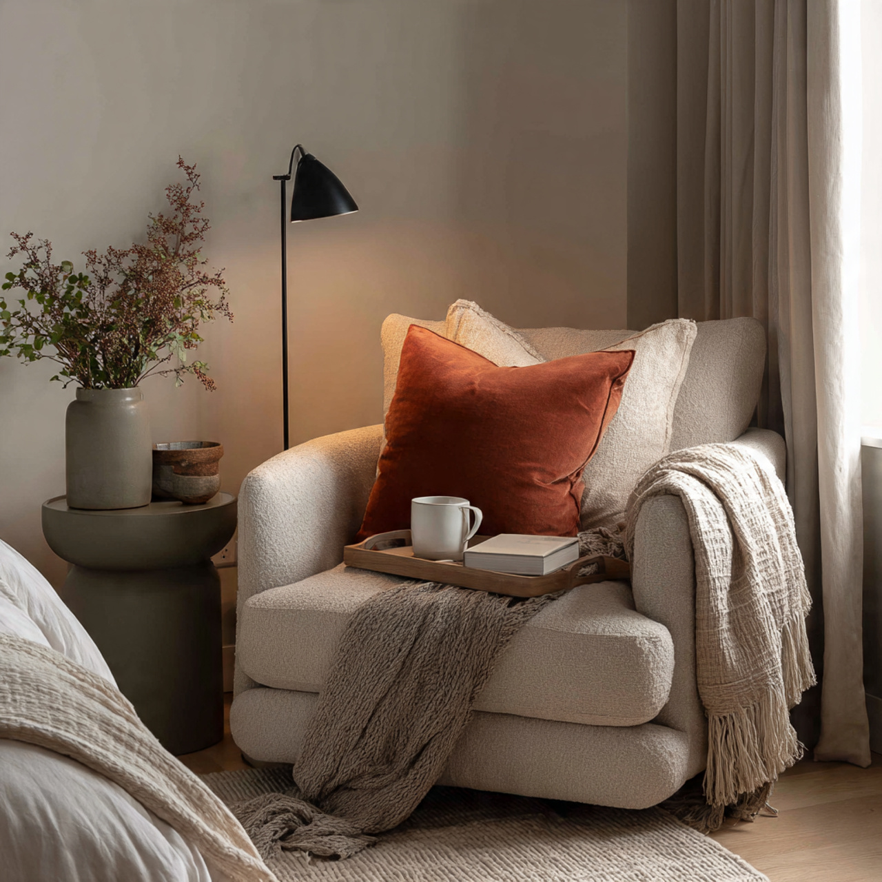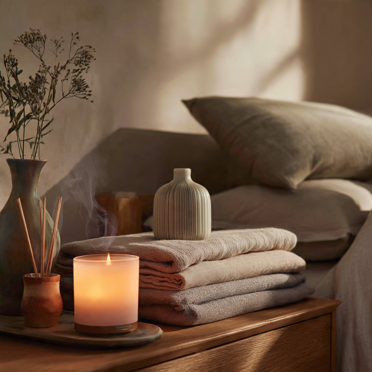 Use scent sparingly through candles, diffusers, or linen sprays. The goal is subtle comfort, not strong fragrance.