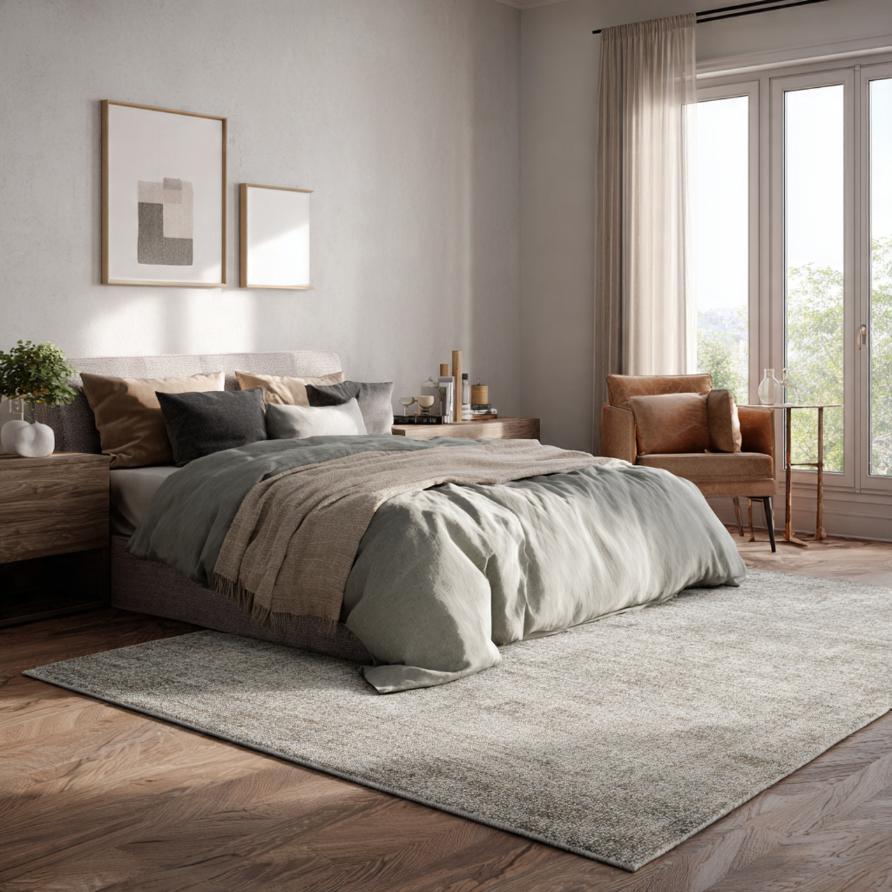 A soft rug can instantly make a bedroom feel warmer and more inviting. Stepping onto something plush in the morning feels far better than cold flooring.