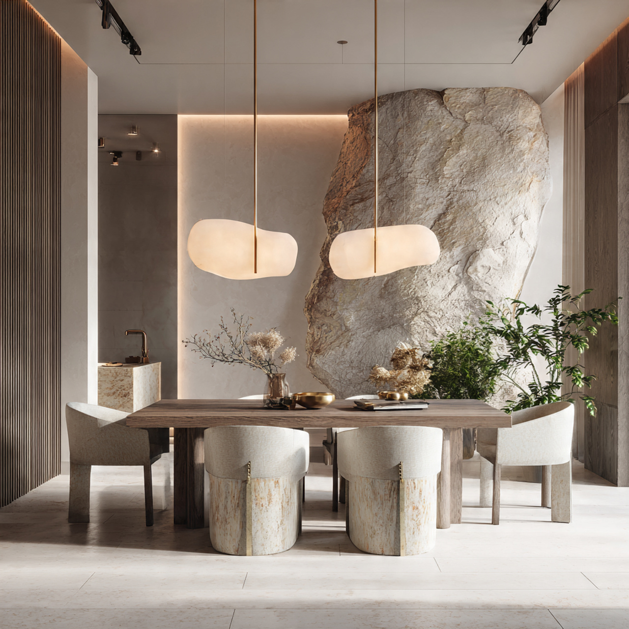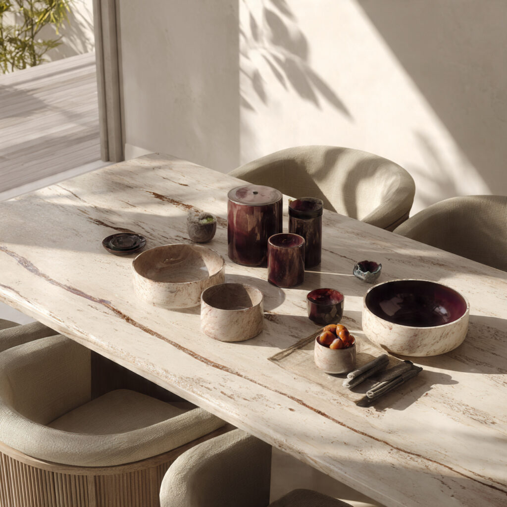 When the table has presence, everything else can stay simple. Clean chairs, bare walls, and soft lighting allow the table to shine naturally.