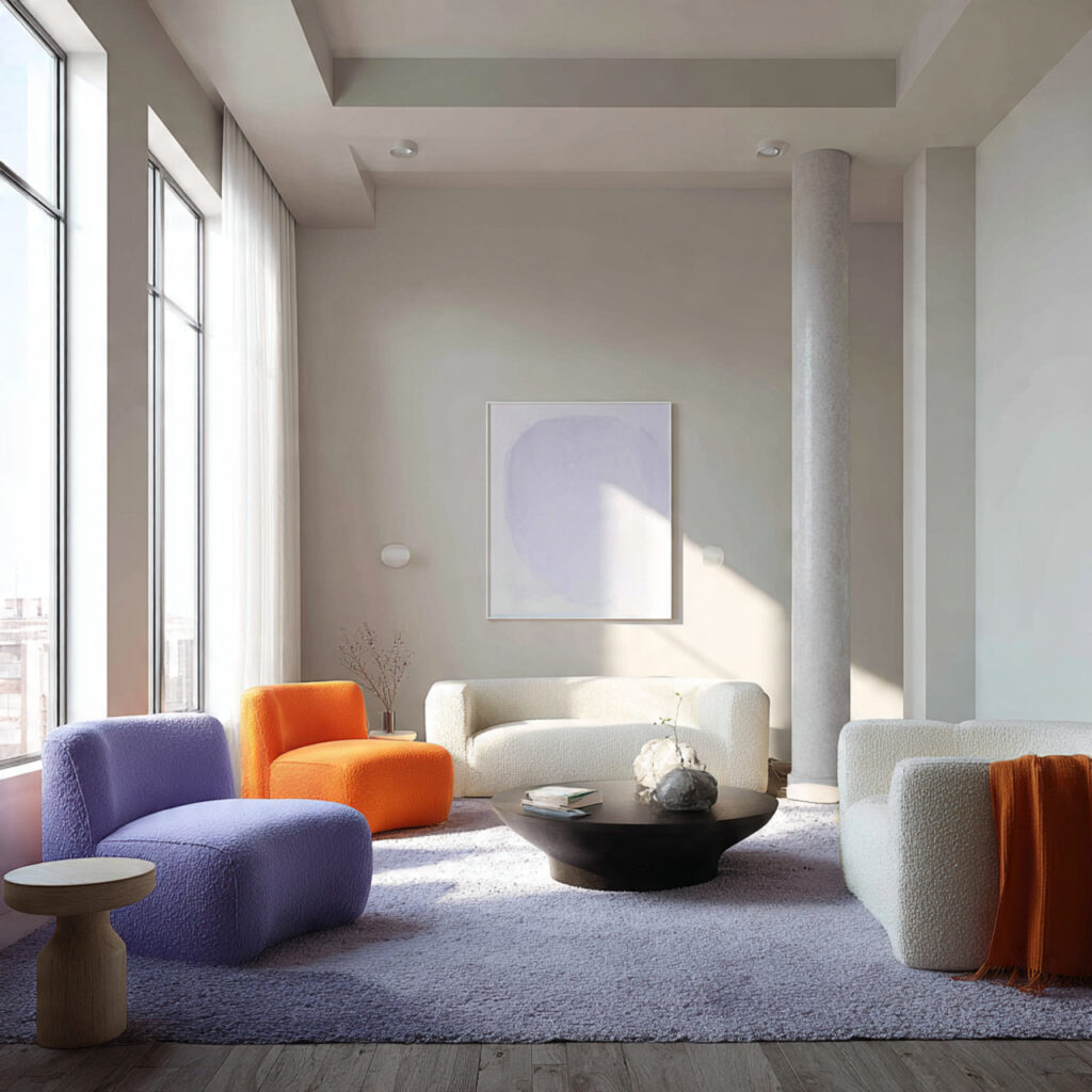 Warm whites create a soft backdrop that allows furniture and textures to stand out gently. The room feels calm, balanced, and easy to spend time in.