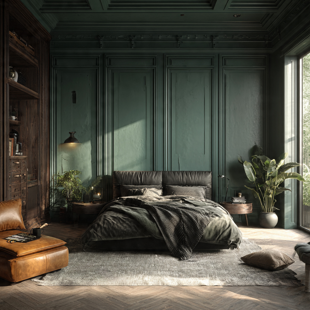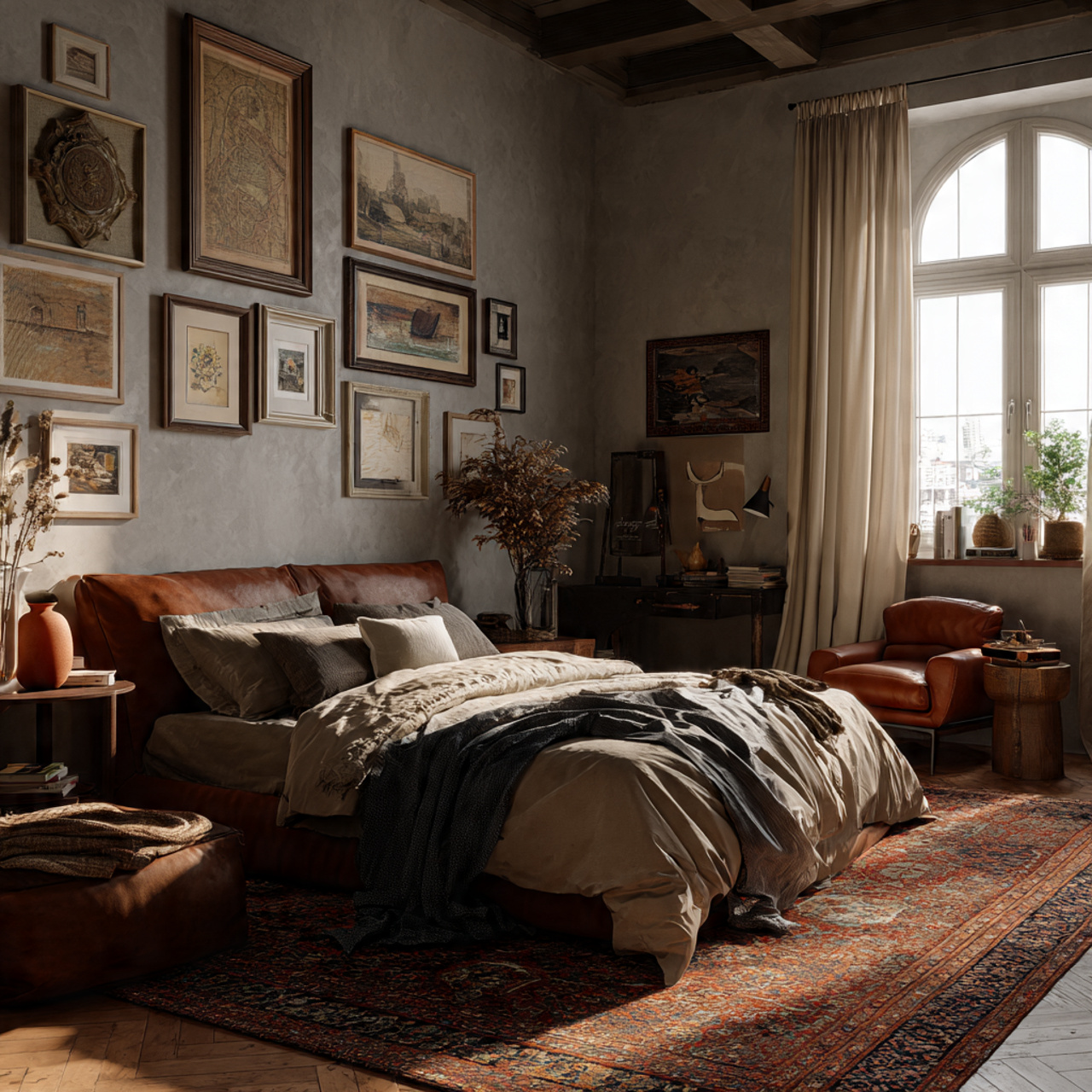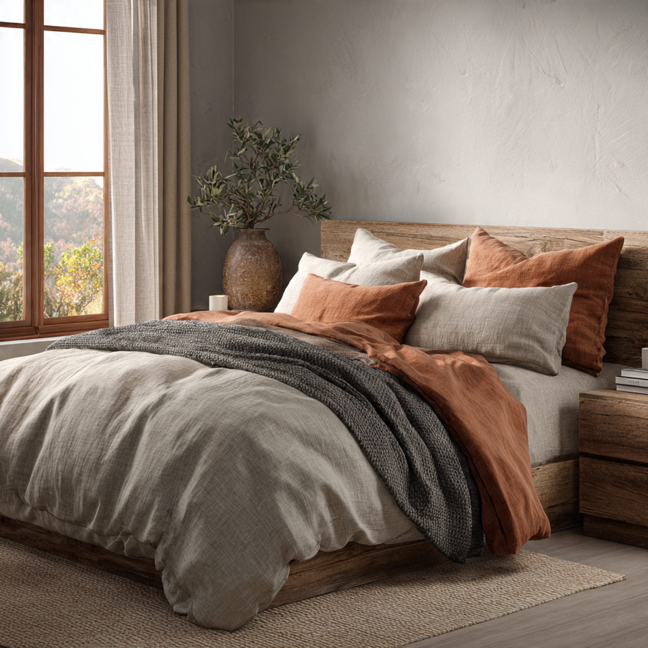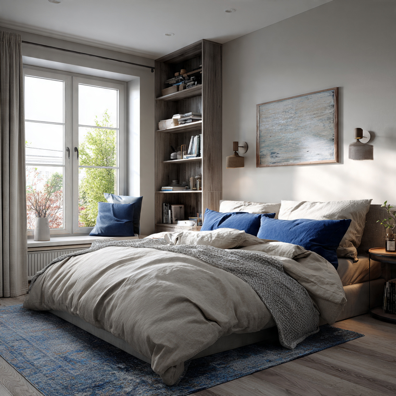 A neutral rug anchors the bedroom and adds warmth underfoot. It also helps define the sleeping area, especially in larger rooms or open layouts.