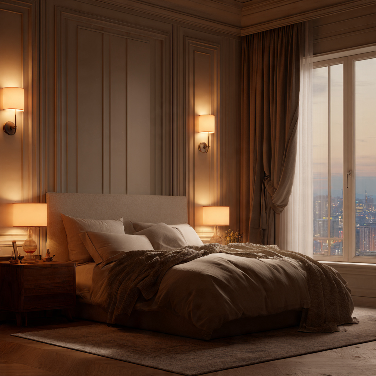 Lighting plays a huge role in how a bedroom feels. Soft, warm light instantly makes the space feel cozy and refined, especially in the evening.