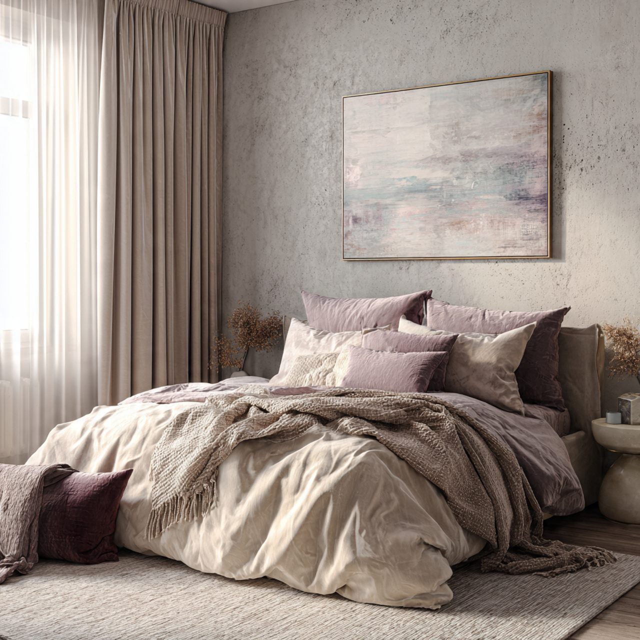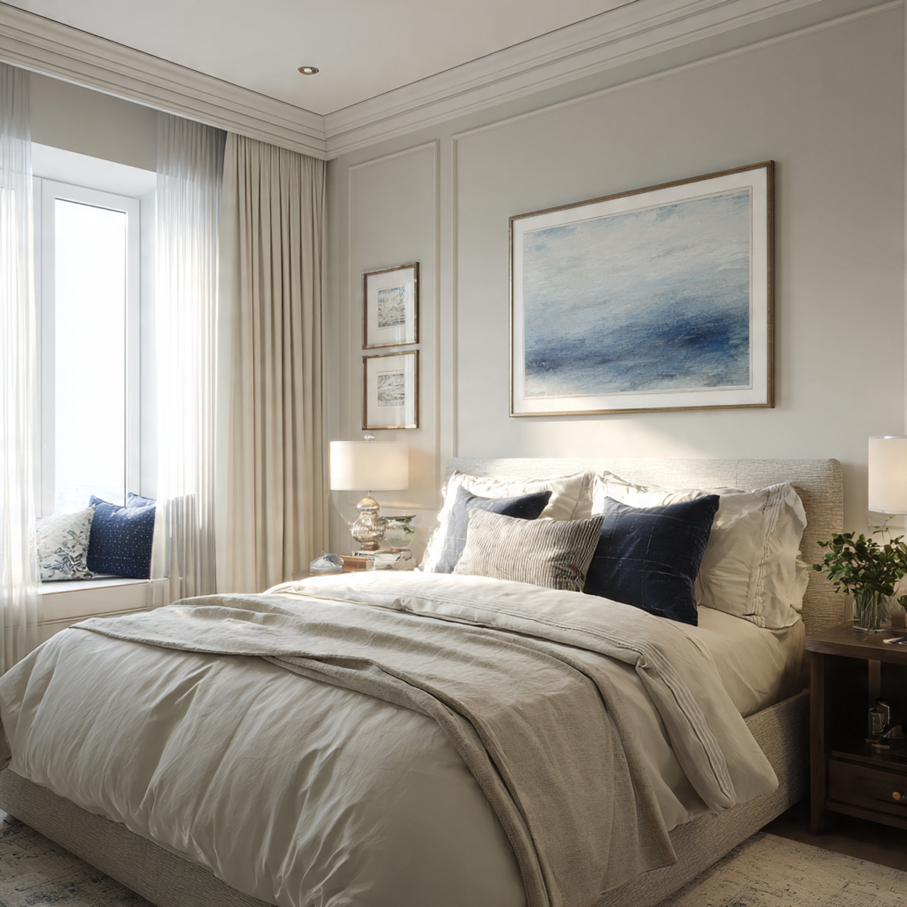 This type of bedroom feels instantly polished because it relies on layers rather than bold statements. Soft neutral bedding creates depth, especially when different fabrics are mixed gently, making the bed feel inviting and well considered.