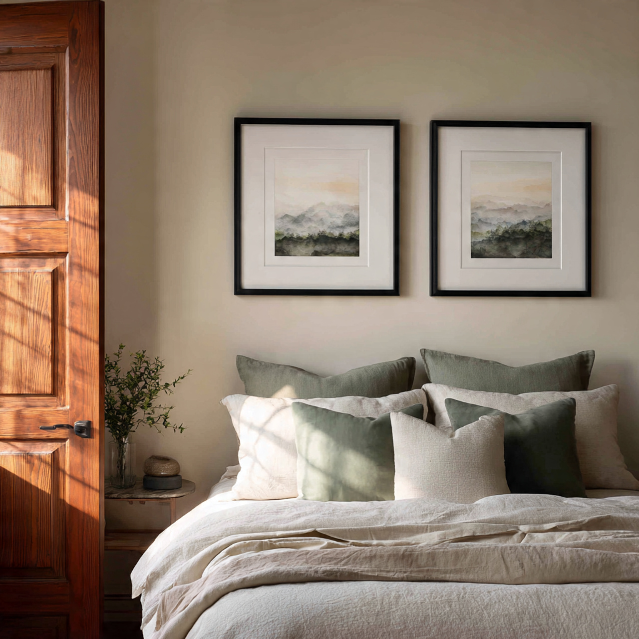 10. Quietly Elegant Bedroom with Framed Artwork