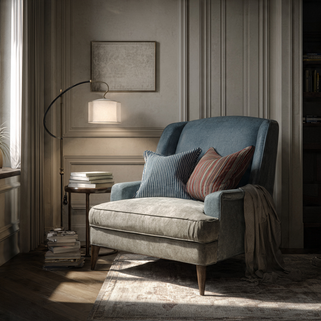- A floor lamp in a corner