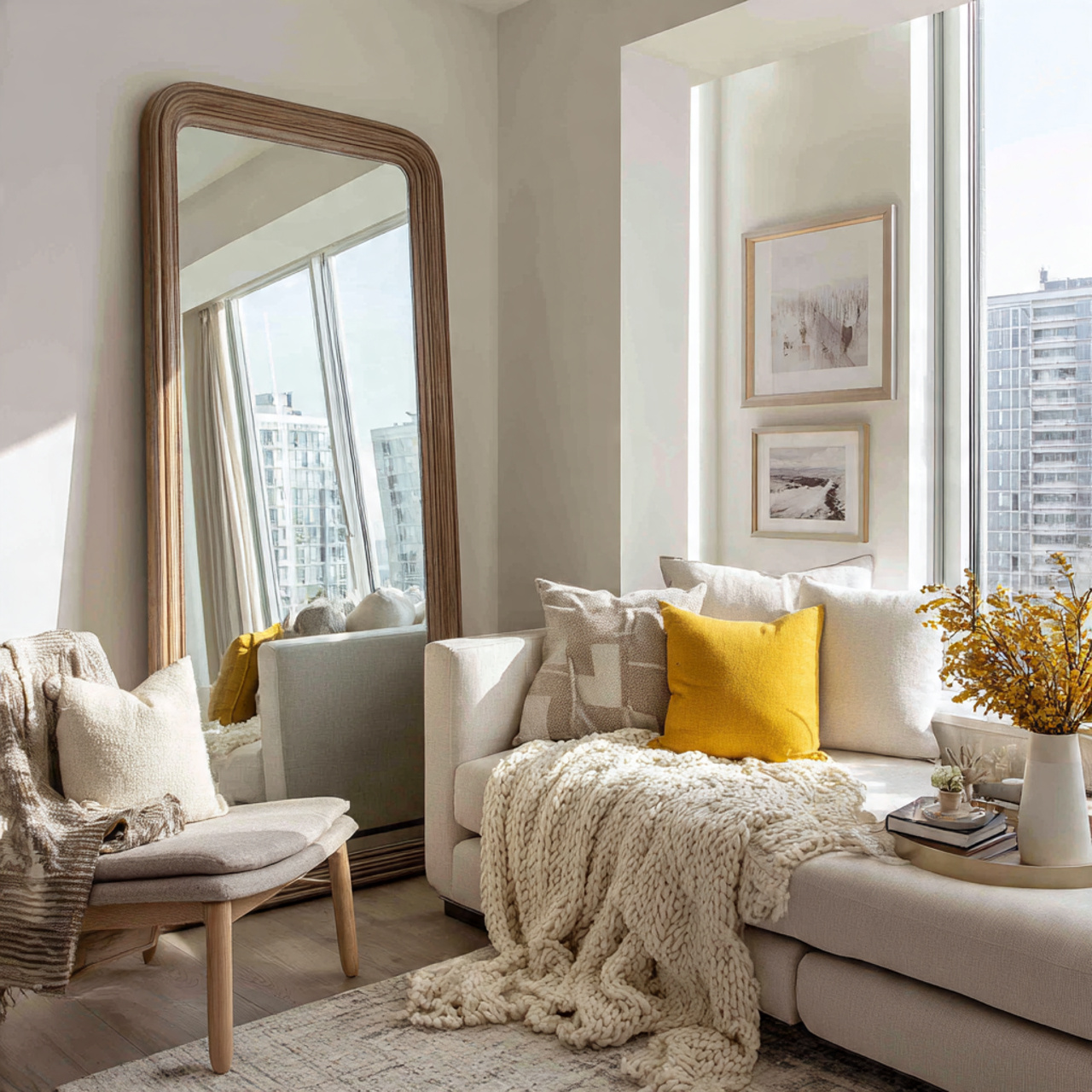 15. Cozy Apartment Living Room Styled with a Large Mirror