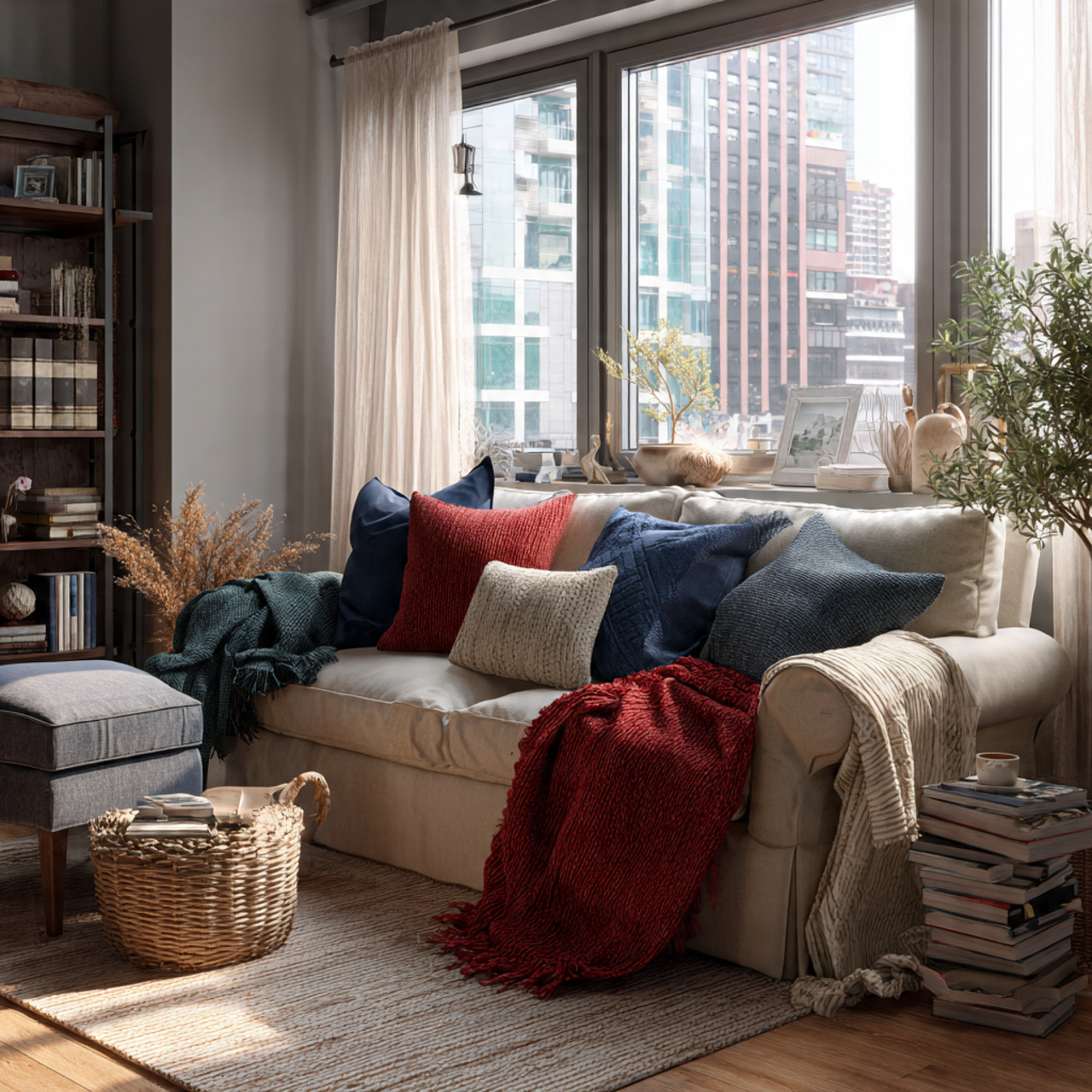 9. Inviting Apartment Living Room Styled with Soft Throw Blankets