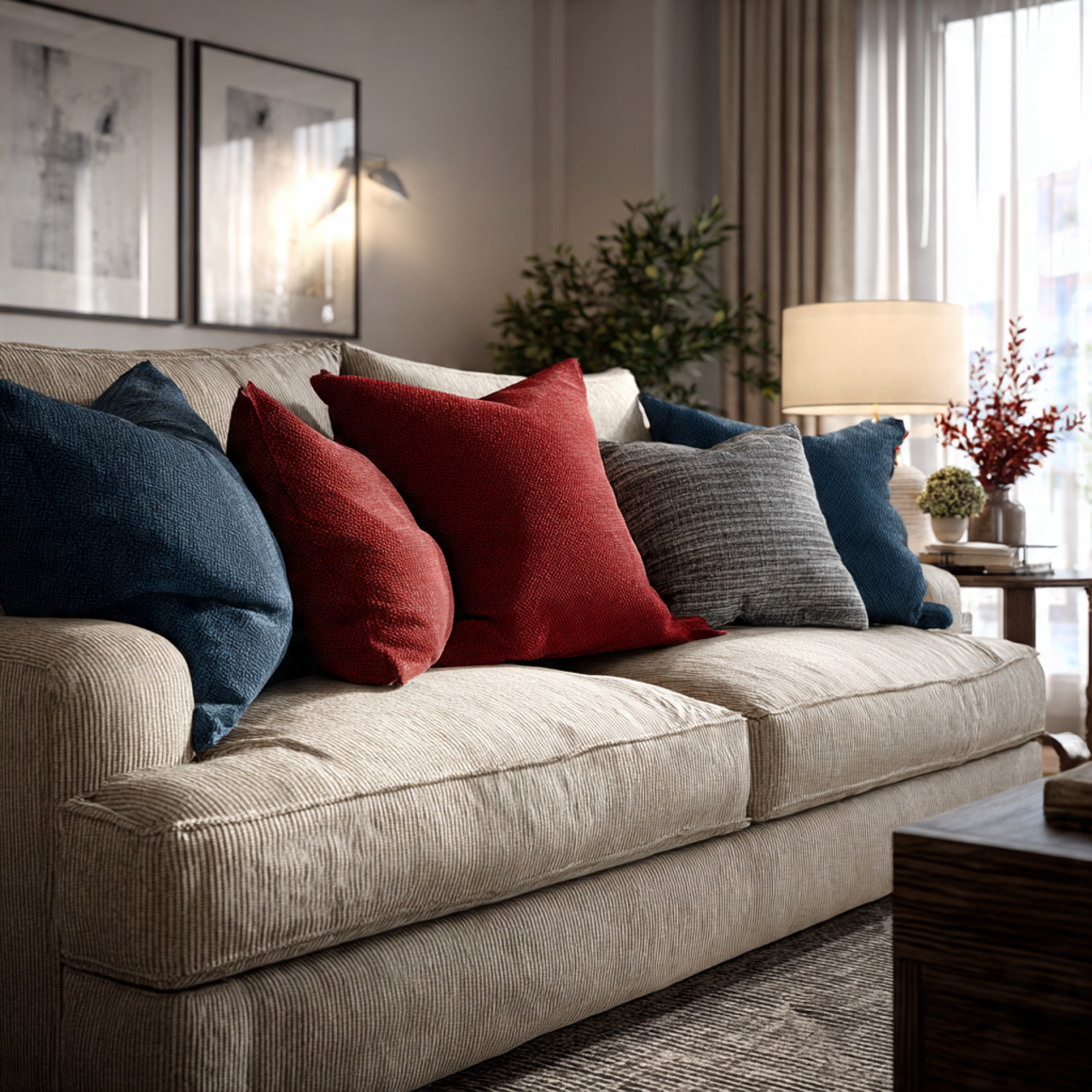 Cushions can change the mood of a living room faster than almost anything else. Muted tones like soft browns, warm grays, and dusty pastels keep things calm and cozy.