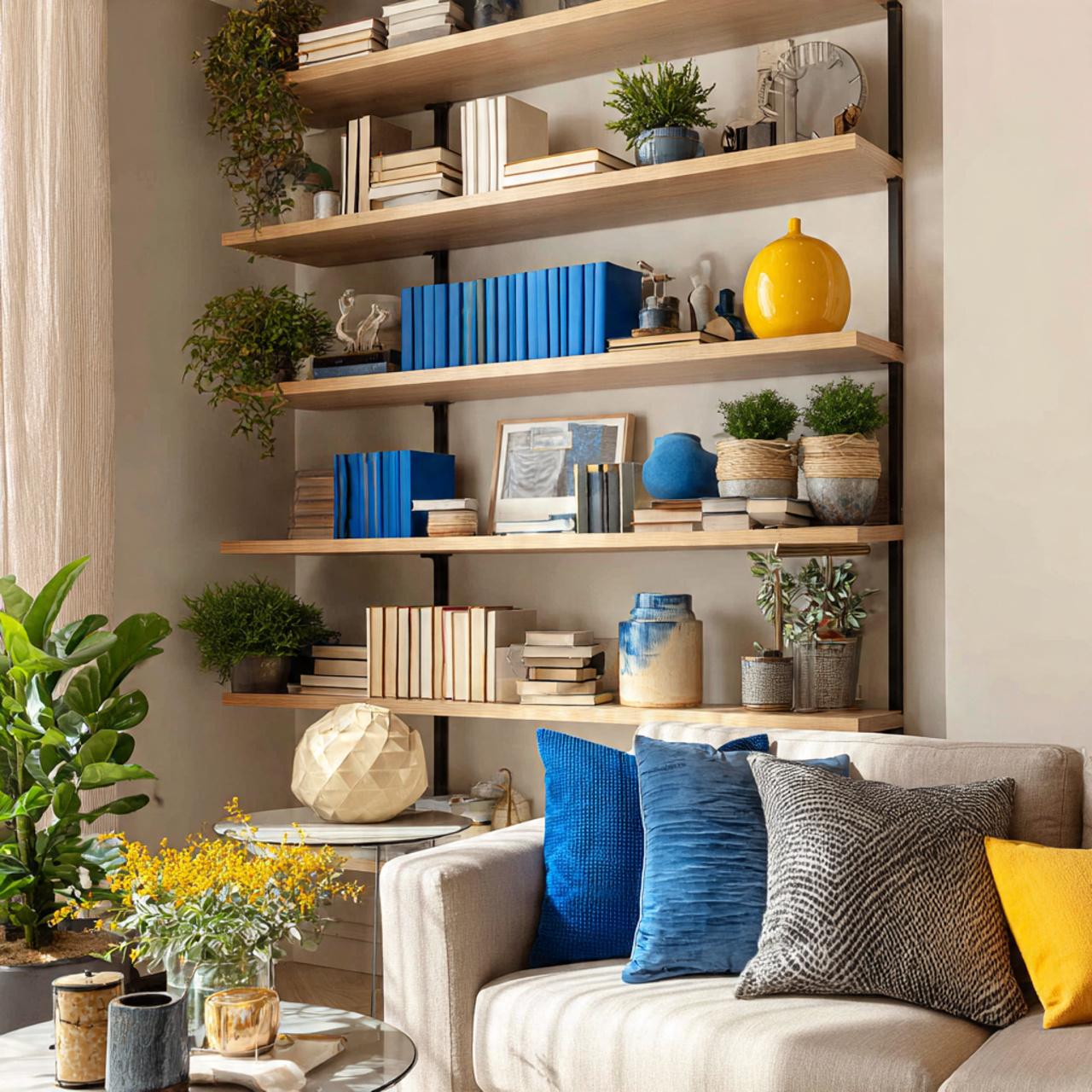 Keep shelves balanced and breathable. This keeps the living room feeling open while still adding personality and warmth.